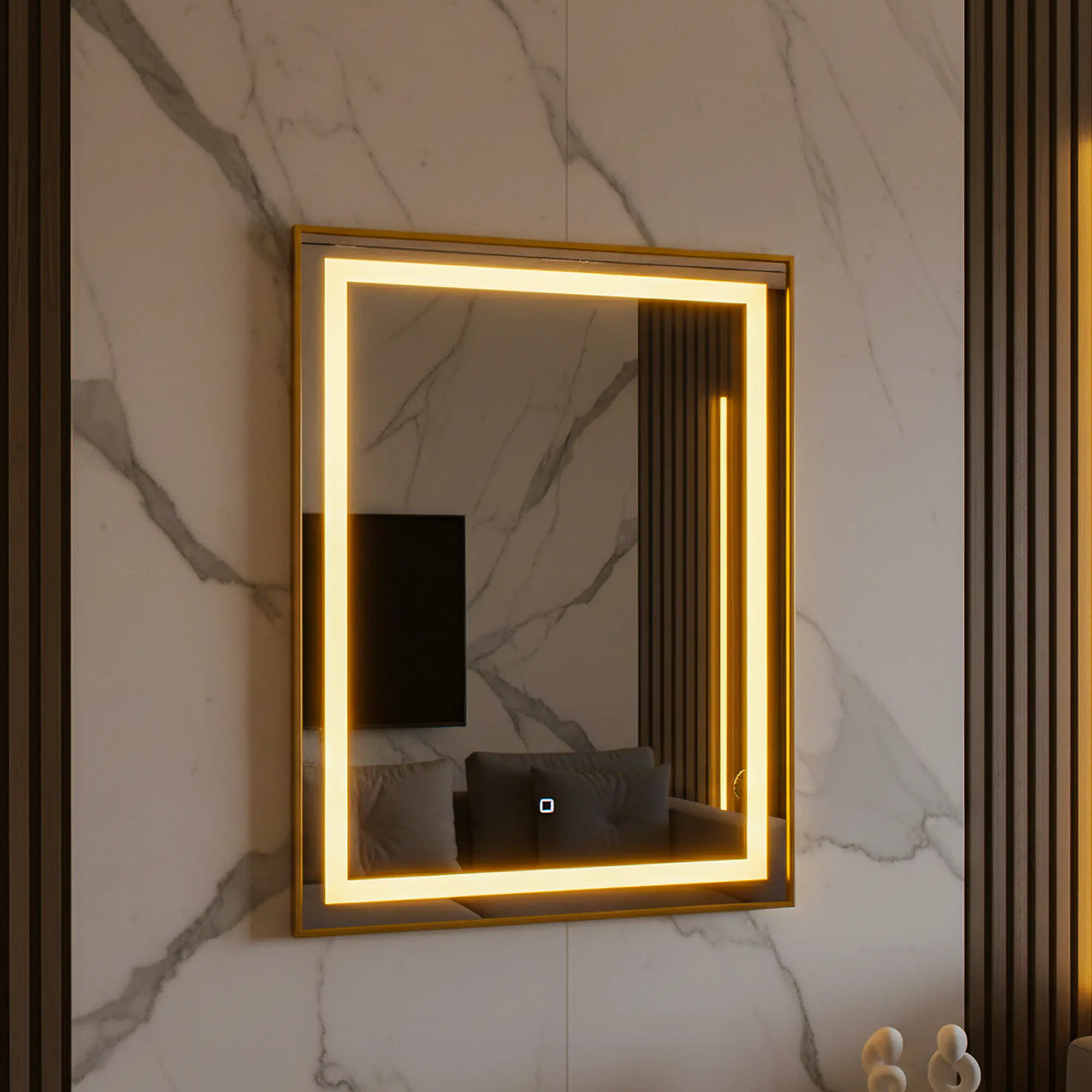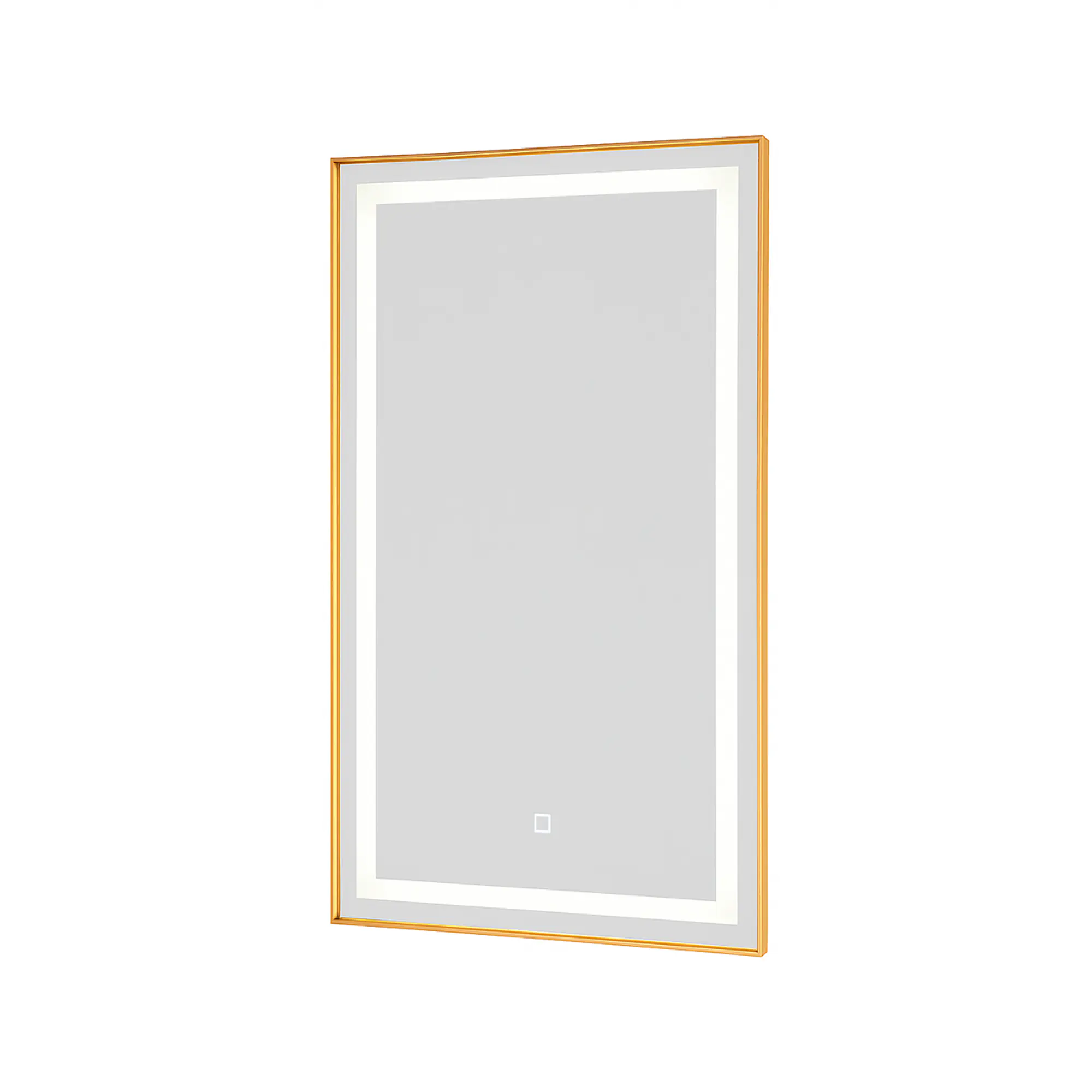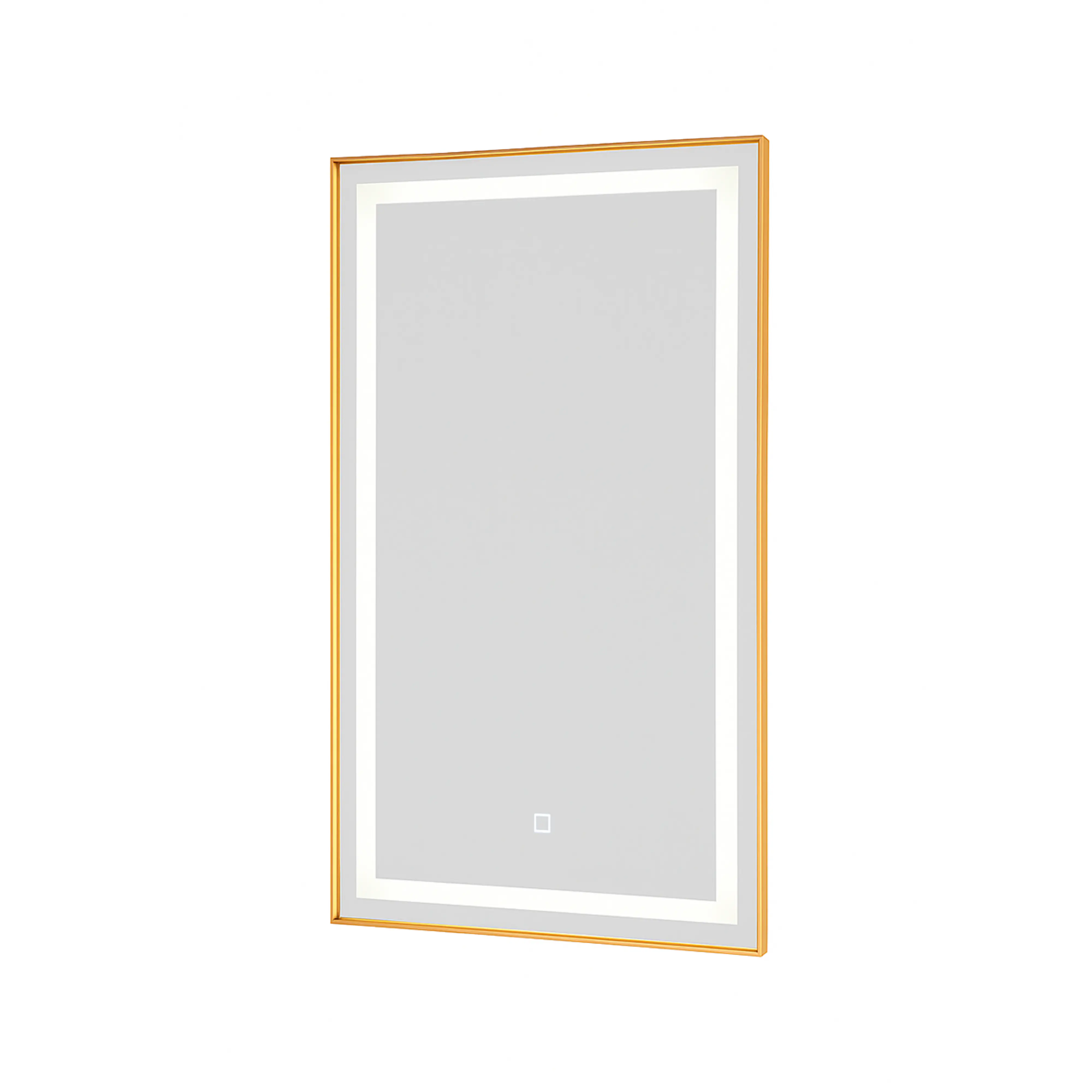 Fabricado com espelho retangular jateado e borda dourada em alumínio, entrega um visual imponente e atual. A iluminação LED integrada (quente, neutra e fria), aliada ao acionamento touch, proporciona conforto visual, funcionalidade e uma experiência premium ao usuário final. Um item que se destaca em banheiros, lavabos, suítes e ambientes de alto padrão.